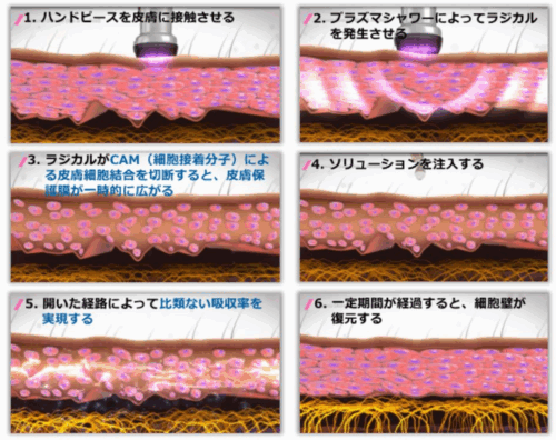 ●プラズマBT:プラズマ波を頭皮に当て、細胞間に隙間を空けることにより、育毛剤(セクレトーム)を痛みなく頭皮に薬液を浸透させます。麻酔は不要です。
