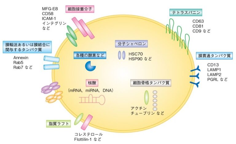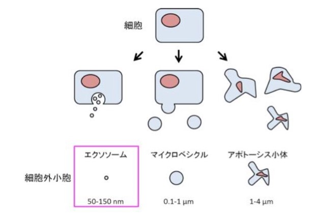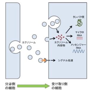 エクソソーム中には、マイクロRNAと呼ばれる遺伝子情報を担う成分やヒートショックプロテイン(HSP)などを含み、細胞の増殖や分化、免疫機能などを調節する働きを持ち、体内の損傷を受けた組織や細胞の機能回復に重要な役割を果たしていると考えられています。