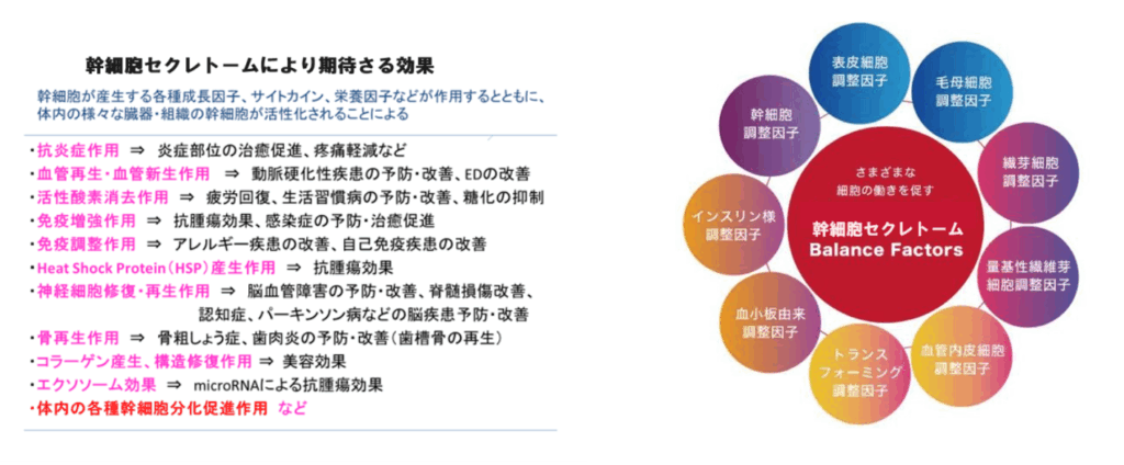 幹細胞が産生したエクソソームに加えて、培養上清に含まれる成長因子、免疫調整因子、抗炎症性因子、神経再生因子が、病態に応じて作用するのに加えて、体内の幹細胞を活性化することにより効果が発現すると考えられている
